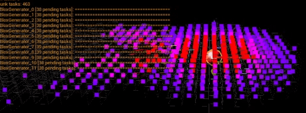 You may even notice the trailing chunk tasks on the left: the player just moved (toward the right) and we can see the chunks on the edges were still not generated, because the ones in the center (closer to the player) were more important.