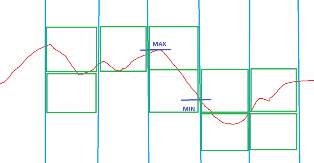 This is a side view of the map, for the sake of the example. The red line is the height (in blocks). The blue vertical lines represent the separation between the 2D cells. The green squares represent the chunks that have been detected as needing to be generated. This is all based on the min and max block heights that we find on each cell.