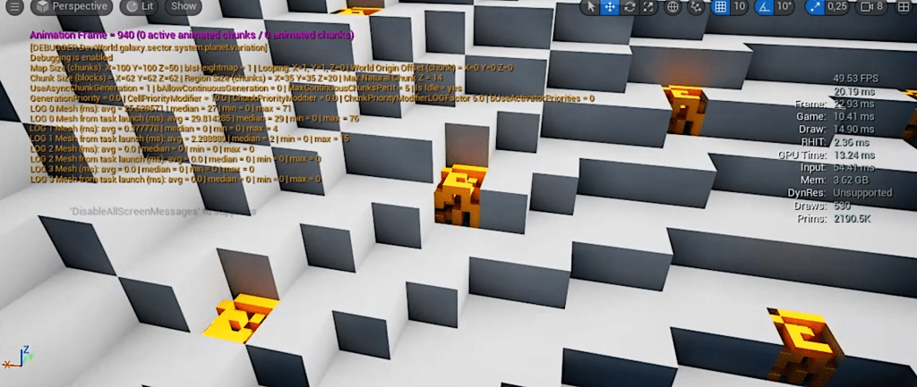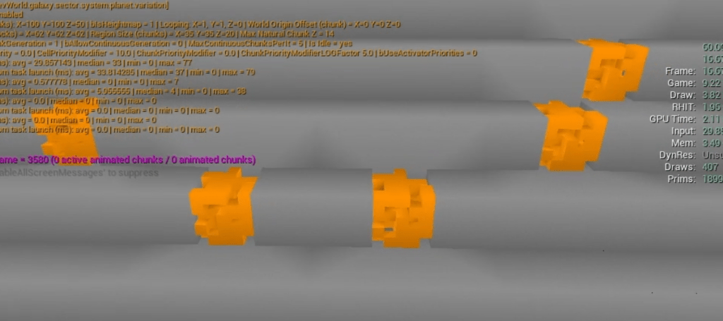 The main drawback of this technique is that each section meshed individually will produce 1 separate draw call. This is why, in my project, I’m only meshing custom blocks for the chunks that are close enough to the player (see previous articles about levels of details). All lower-res / background chunks virtually merge their sections together and mesh everything as simple, cubic blocks.