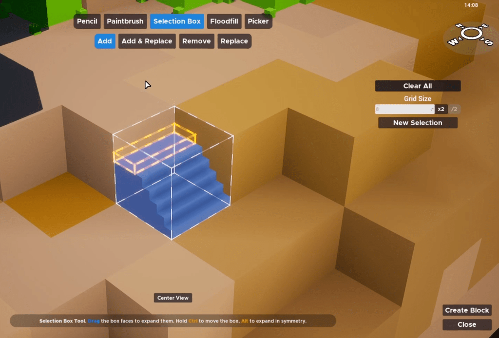 Here, the user has opened a Custom Block Designer to place, block by block, various materials on a virtual 3d grid. In the game code, the result is indistinguishable from a regular chunk, and so it can be meshed with the exact same methods.