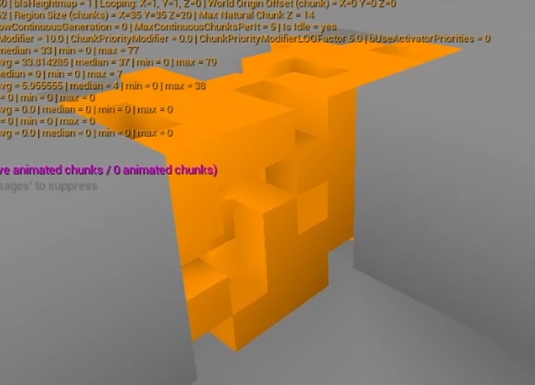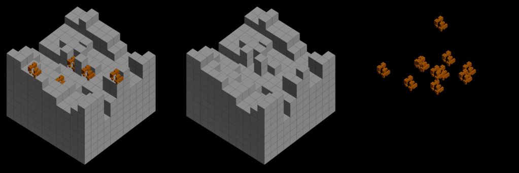 The above is an unlit view of a piece of chunk. You should be able to notice the lighter shading on cubic (grey) blocks around the custom blocks (orange). If these custom blocks had been cubic (ie not custom blocks), the ambient occlusion would have been darker. As a reminder, in this example the orange custom block is relatively full (almost a full cubic block), but it could have been a single mini-block on one corner or in the middle, and having darker AO on the cubic blocks would have been very jarring. This is why we can’t assume custom blocks are ‘solid’.